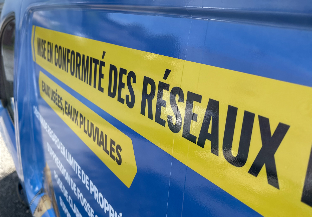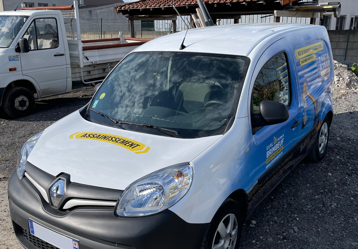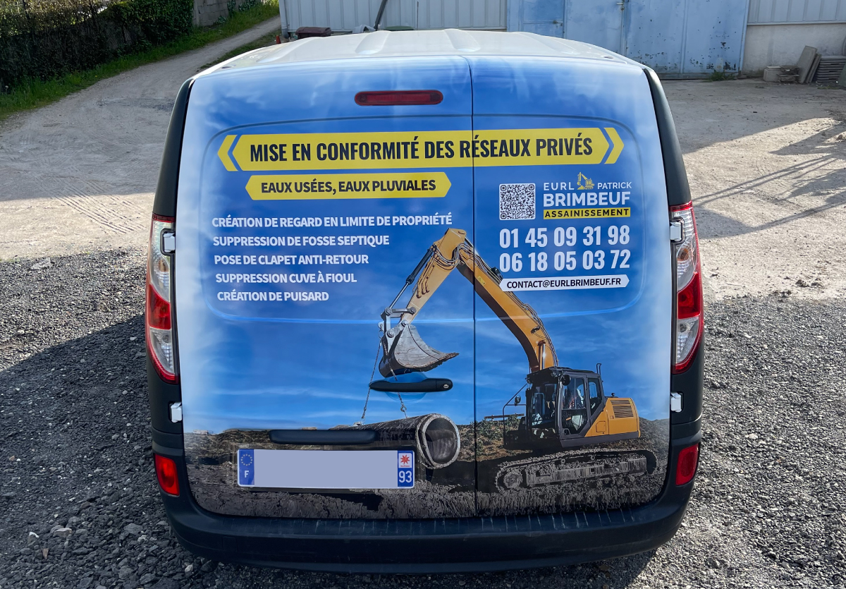 Réalisation d'un marquage publicitaire adhésif intégral sur un véhicule utilitaire Renault Kangoo.